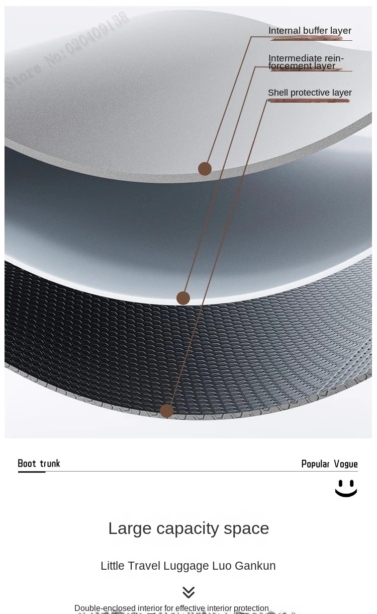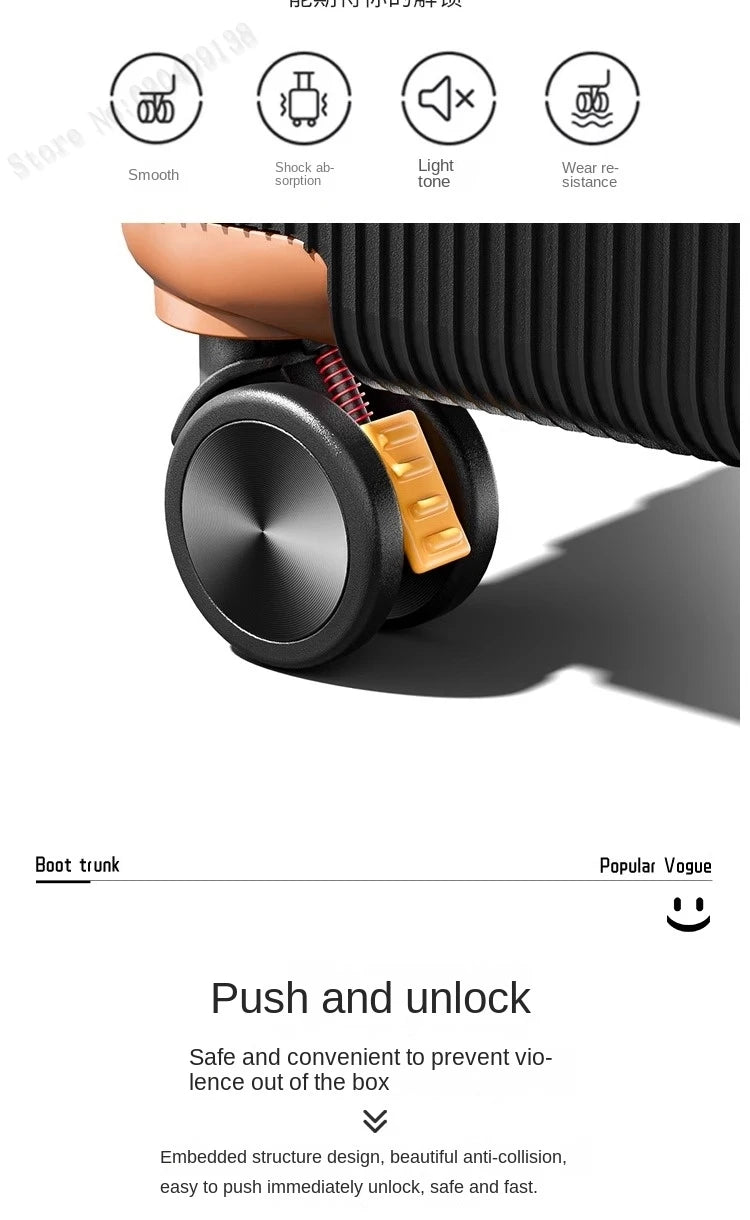 Alt text: Trolley suitcase with mute brake wheels for secure placement