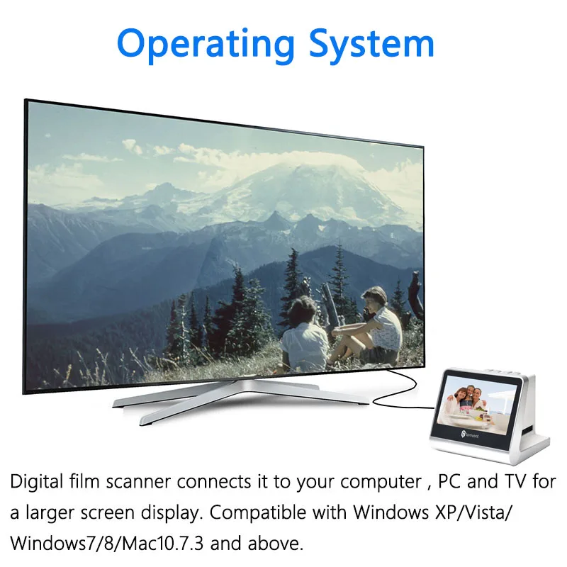 Operating System Support: Digital film scanner connects it to your computer, PC and TV for a larger screen display. Compatible with Windows XPvista/Windows7/8/ Mac10.7.3 and above.