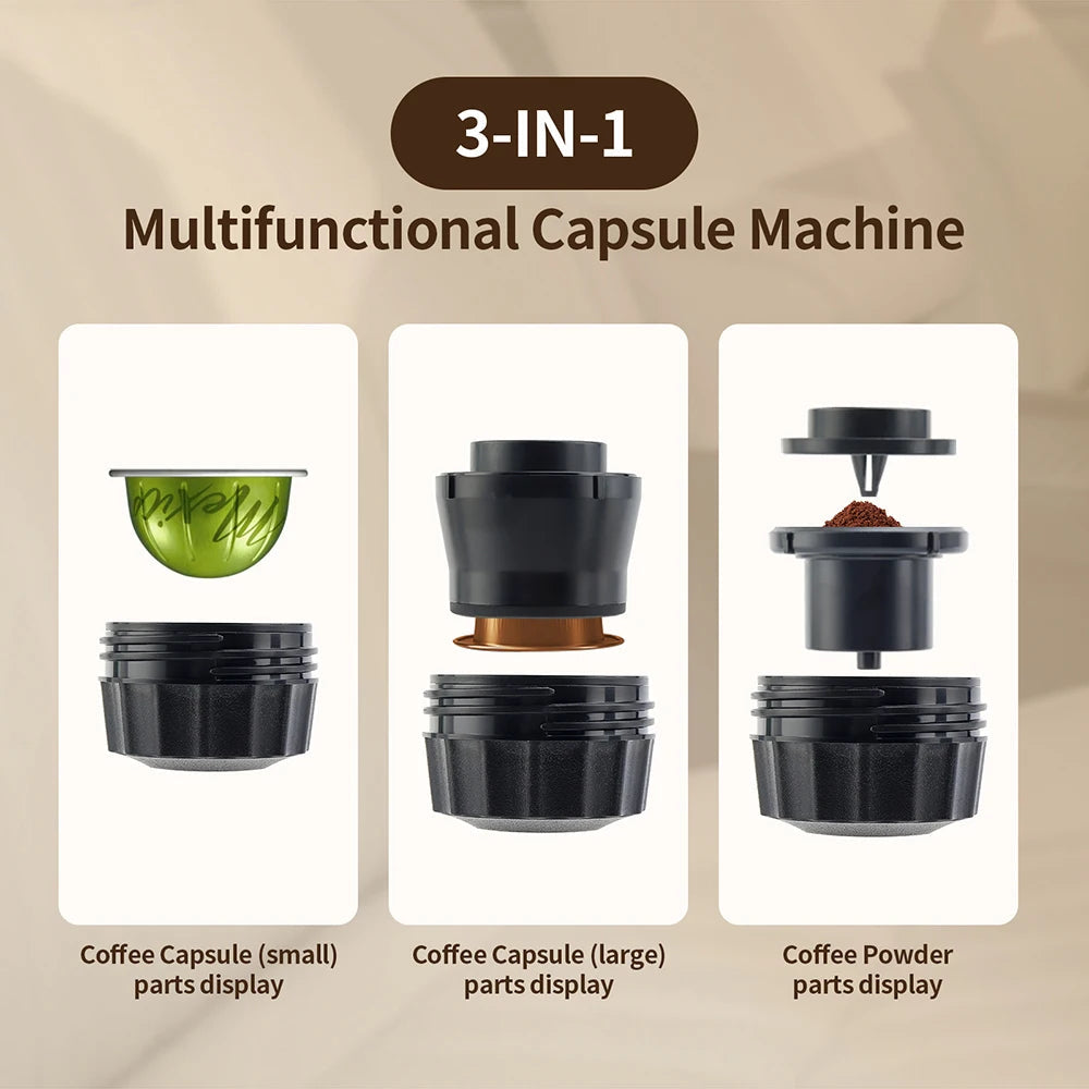 1. Multi-function compatibility. The portable Italian espresso machine features a multifunctional 3-in-1 design that holds both small and large capsules, as well as ground coffee, offering multiple brewing options to suit your preferences.