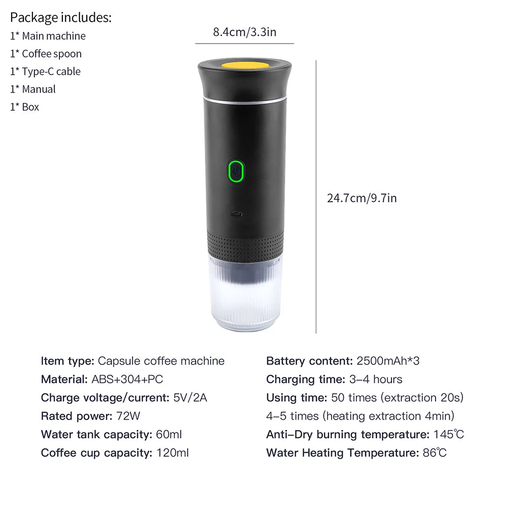 6. Compact and convenient design. With the push of a button, you can start brewing coffee without complicated setup. Its portable design makes the coffee maker lightweight and easy to carry, allowing you to enjoy a delicious coffee anytime, anywhere, whether outdoors, on the road, or in the office. In addition, it can help you save time and money by enabling you to quickly make coffee at home or on the go without having to spend time and money looking for a coffee shop or barista.