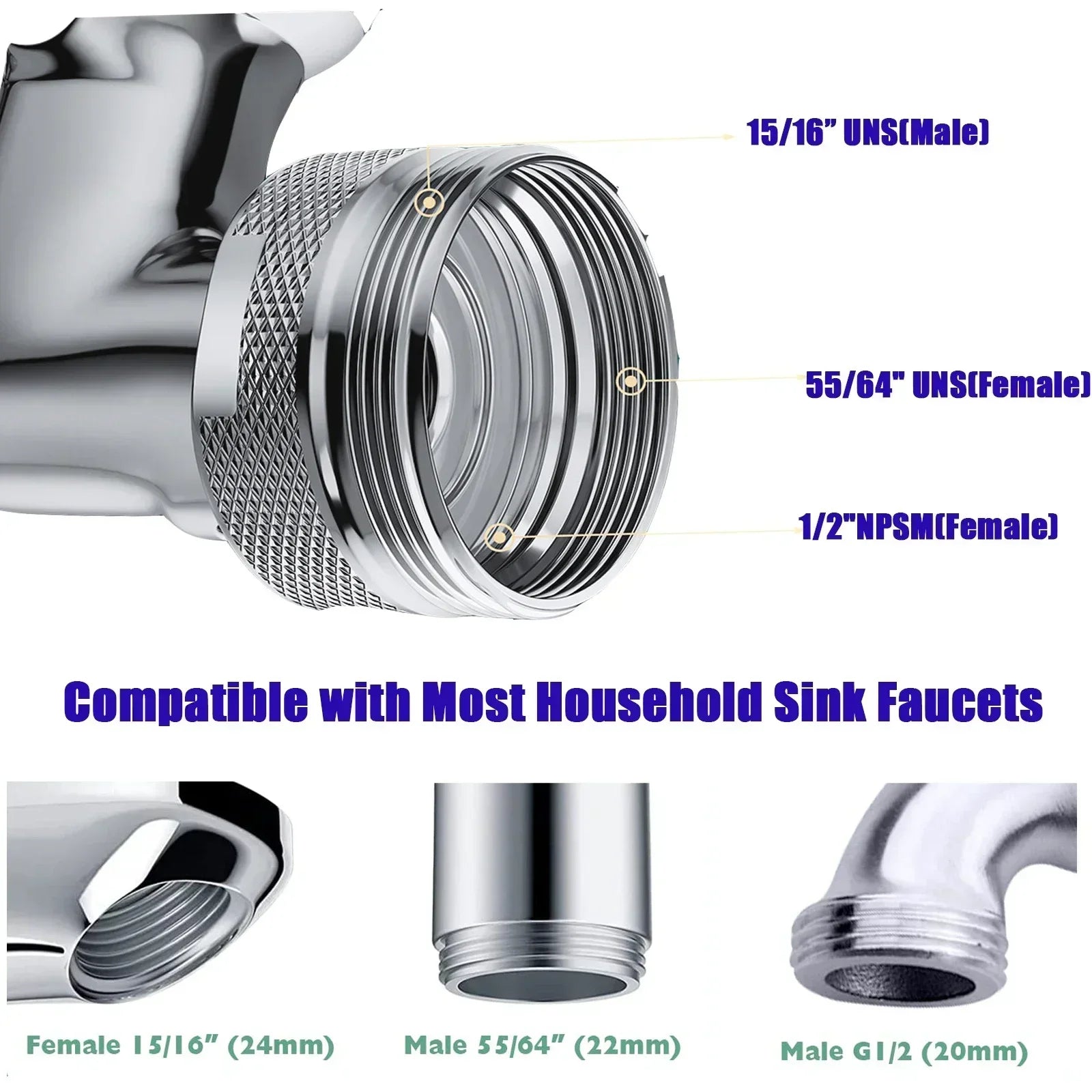 - 【Connection Feature】The robotic arm faucet extender is compatible with most bathroom/kitchen /laundry sink faucets/RV Camper. Faucet aerator provides 3 different threads, Female Thread 55/64-UNS (M22), External Female Thread G1/2'' NPSM (M20), and Also Fit for The Male Thread: 15/16-27UNS (M24), One fits all design, compatible with most faucets.