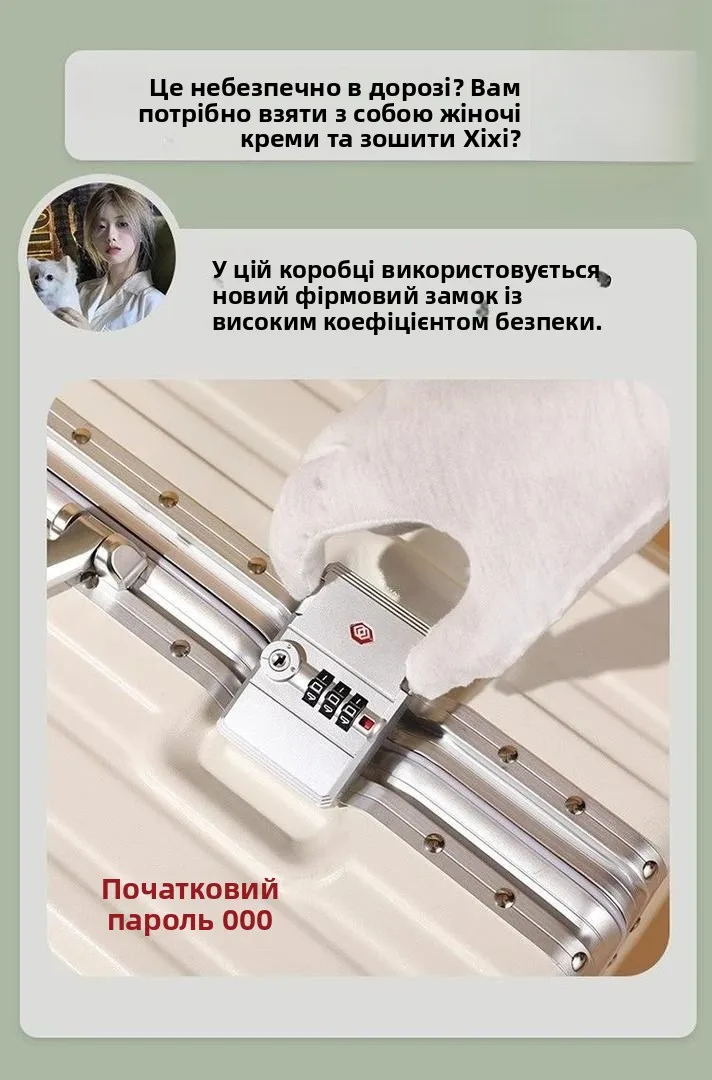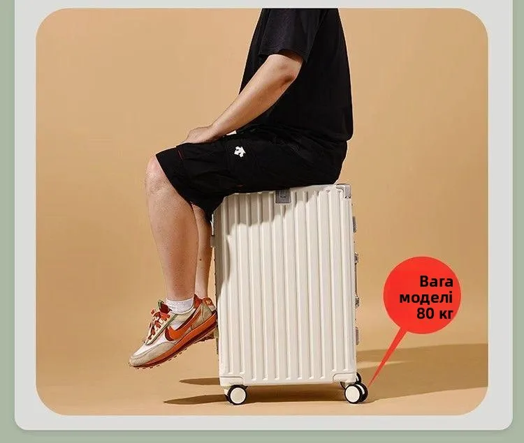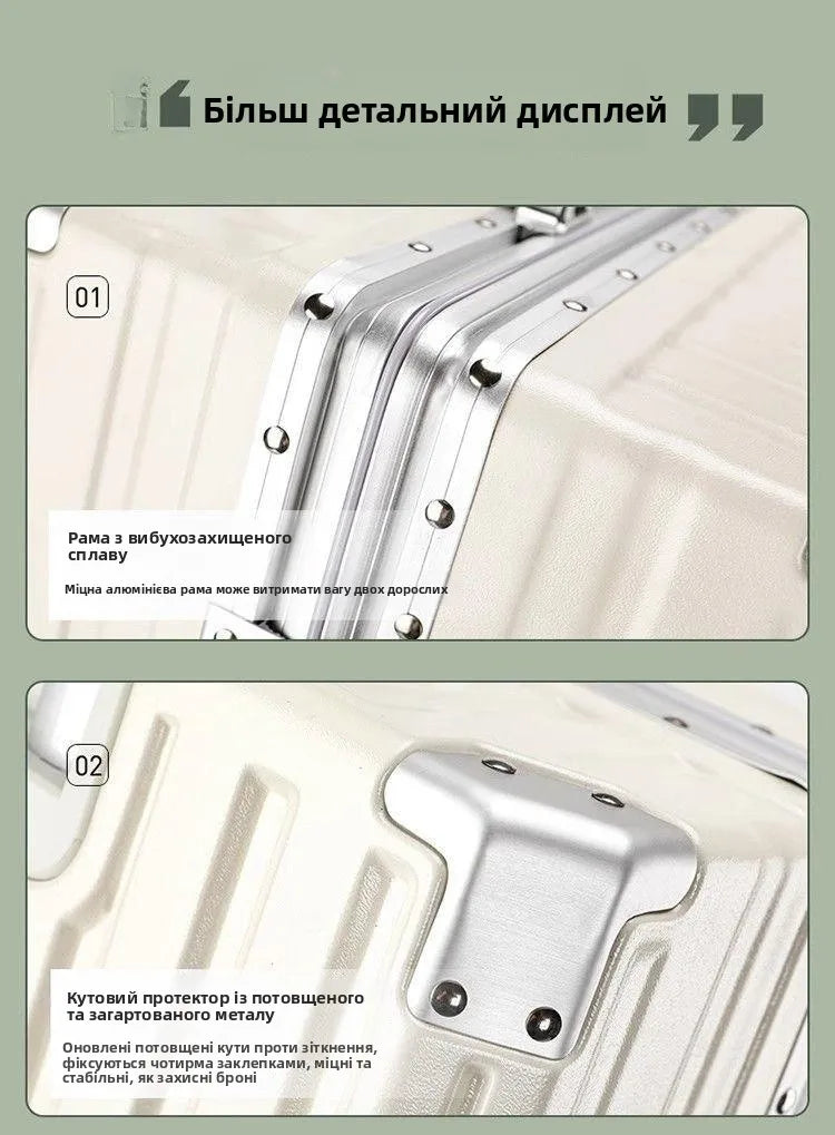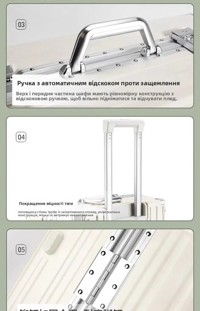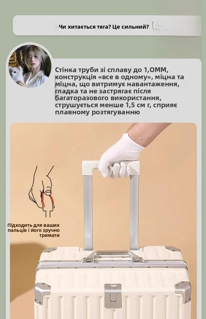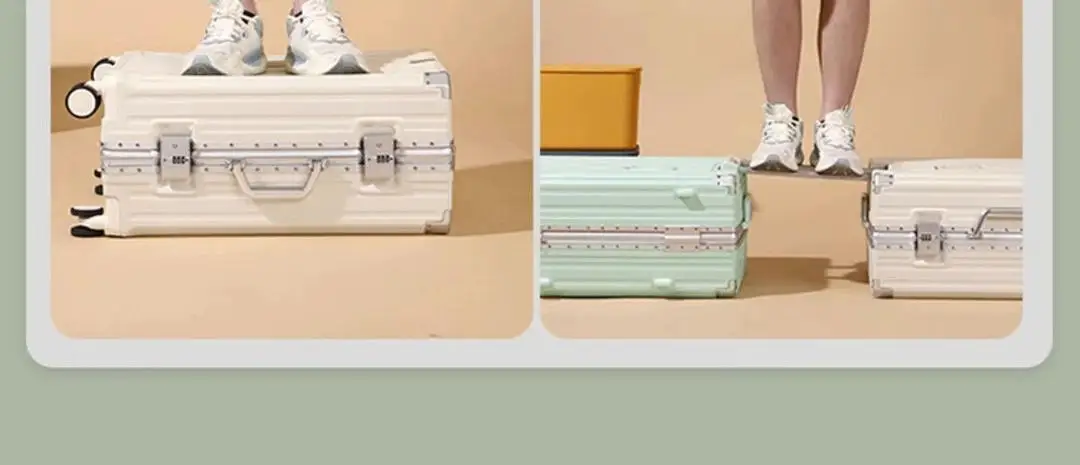 This travel suitcase boasts a stylish and trendy design, perfect for both men and women. Its sleek aluminum frame and universal appeal make it a great choice for students and travelers alike.