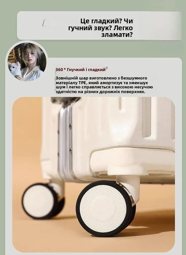 The suitcase features silent rolling wheels, ensuring a smooth and noise-free journey. Its universal wheel design allows for easy maneuverability in any direction.