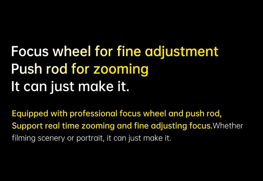 Equipado con rueda de enfoque profesional y varilla de empuje, admite zoom en tiempo real y ajuste fino de enfoque. Ya sea que esté filmando paisajes o retratos, puede hacerlo.