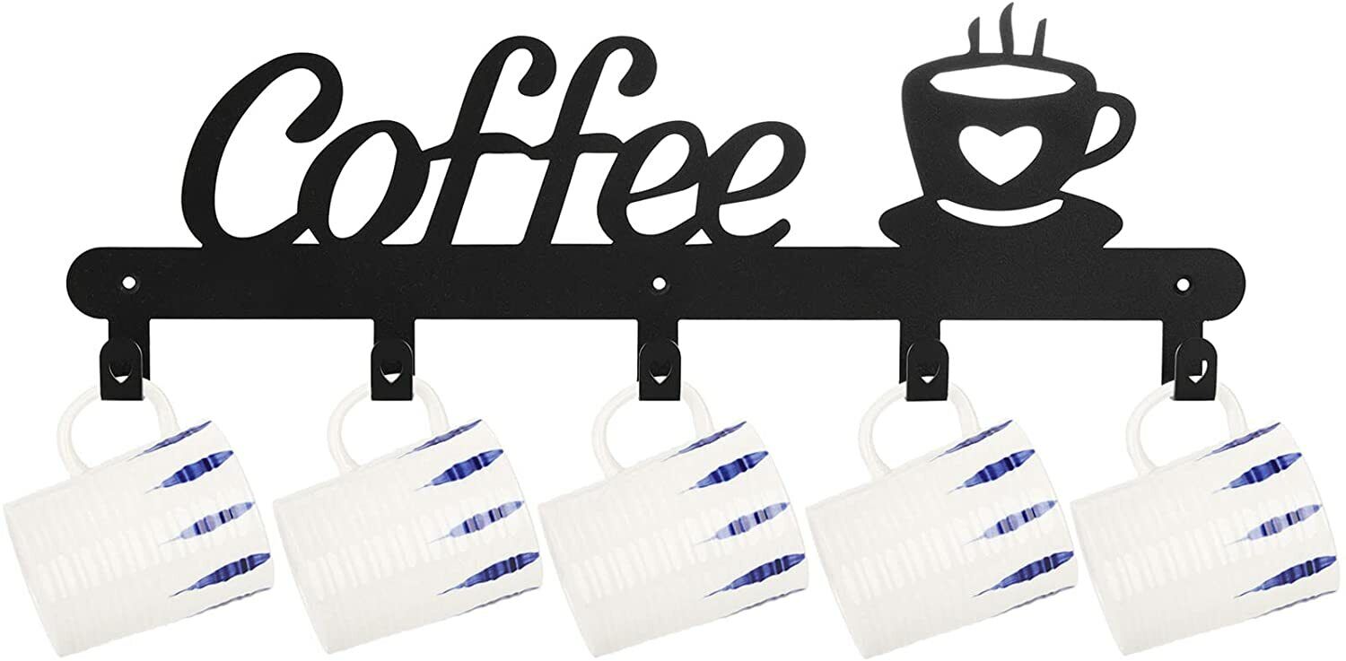 The stylish metal coffee mug hanger is designed with "coffee" letter and vivid coffee mugs pattern, and the hooks are designed with hollowed-out heart, each part is very eye-catching, adds great addition to your coffee bar, kitchen.