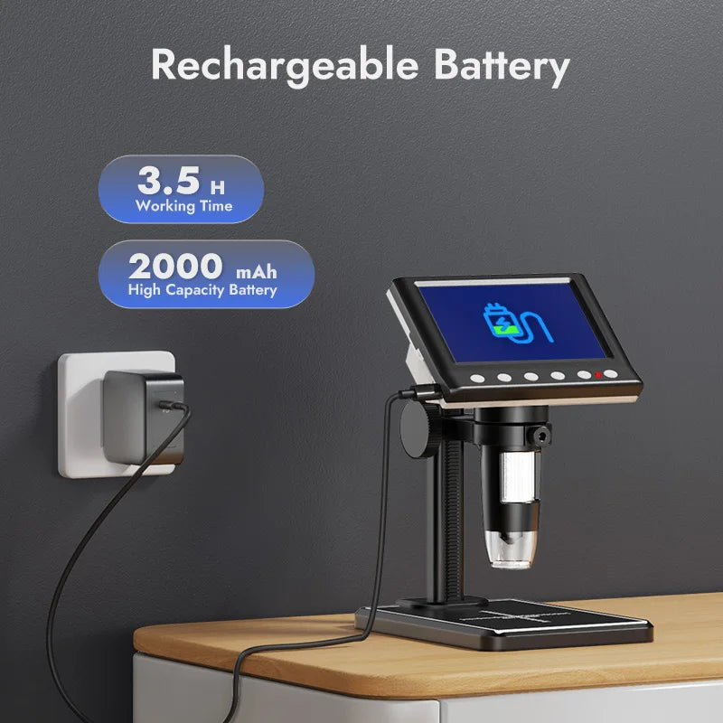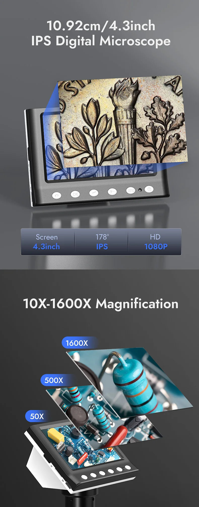 【4.3 INCH LCD DIGITAL MICROSCOPE, HIGH DEFINITION 】:Hayve electron microscope adopts 1080P high-definition digital imaging. LCD screen displays real-time clear images and high-quality videos in the full illumination view of eight LED fill lights. Large screen observation enhances ergonomics and eliminates eye and neck fatigue.