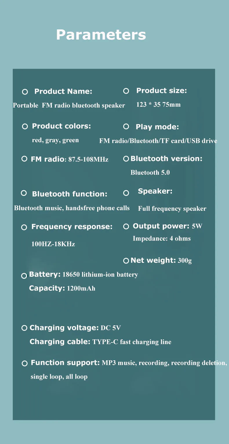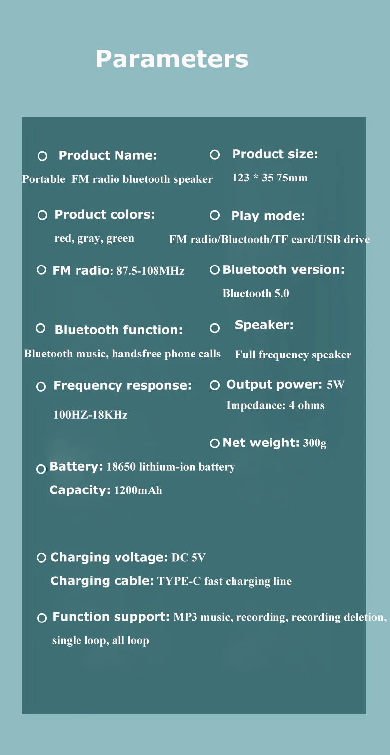 Playback mode: FM radio/Bluetooth/TF card/USB drive