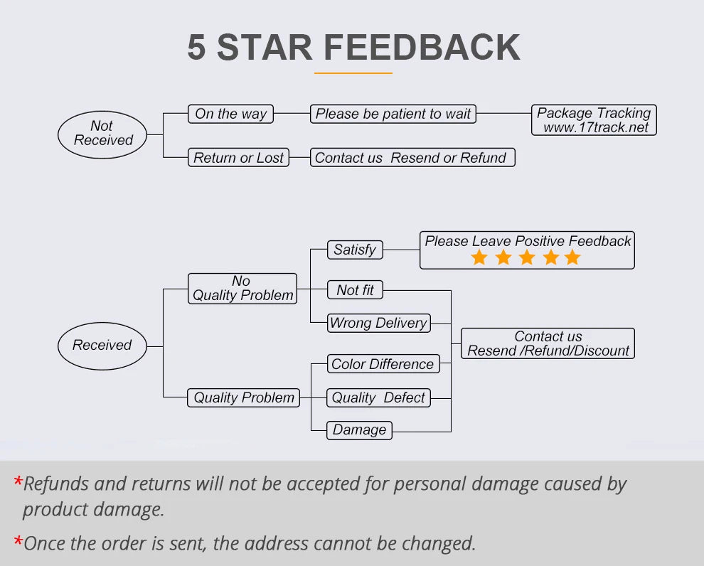 Refund or Return as your wish if you are not satisfied with our products,pls kindly contact with our customer servier freely,we will fix the problem for you and give u a satisfied answer