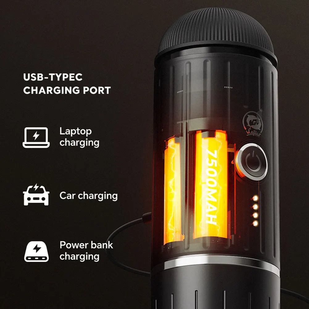 1.Ultra-Portable Coffee Experience: Enjoy the luxury of freshly brewed espresso anywhere you go with our portable coffee maker. Designed for the coffee lover on-the-move, it combines lightweight convenience with a powerful extraction process, delivering creamy, rich espresso from your favorite coffee grounds or capsules. Specification: Origin: Mainland China Material: Food Grade Plastic, 304 Stainless Steel, Abs Rated Power: 100W Lithium Battery Specifications: 7500mah 30wh Input Voltage/Current: 20v-1.5a Rated Operating Voltage/Current: 12v/9a Tank Capacity: 80ml Charging Port: USB Type-C Size: 248*75mm/9.67*2.93in Features: Large capacity and strong endurance It can be fully charged in about 80 minutes 1 full charge: About 200 brews (no heat extraction required) Brew about 3-4 times (heated with 50ml of room temperature water) Brew about 2 times (heat with 50ml ice water) Working hours: About 1 minute: It can be extracted without heating About 4 minutes: Heat 50ml water About 8 minutes: Heat 70ml water 50ML water can make a 40ML cup of coffee, 70ML water can make a 60ML cup of coffee (2 cups)
