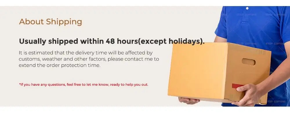 - The expected delivery date will be affected by customs, weather etc., sometimes it may take a little bit longer to receive the package,please contact with us to extend your order protection time