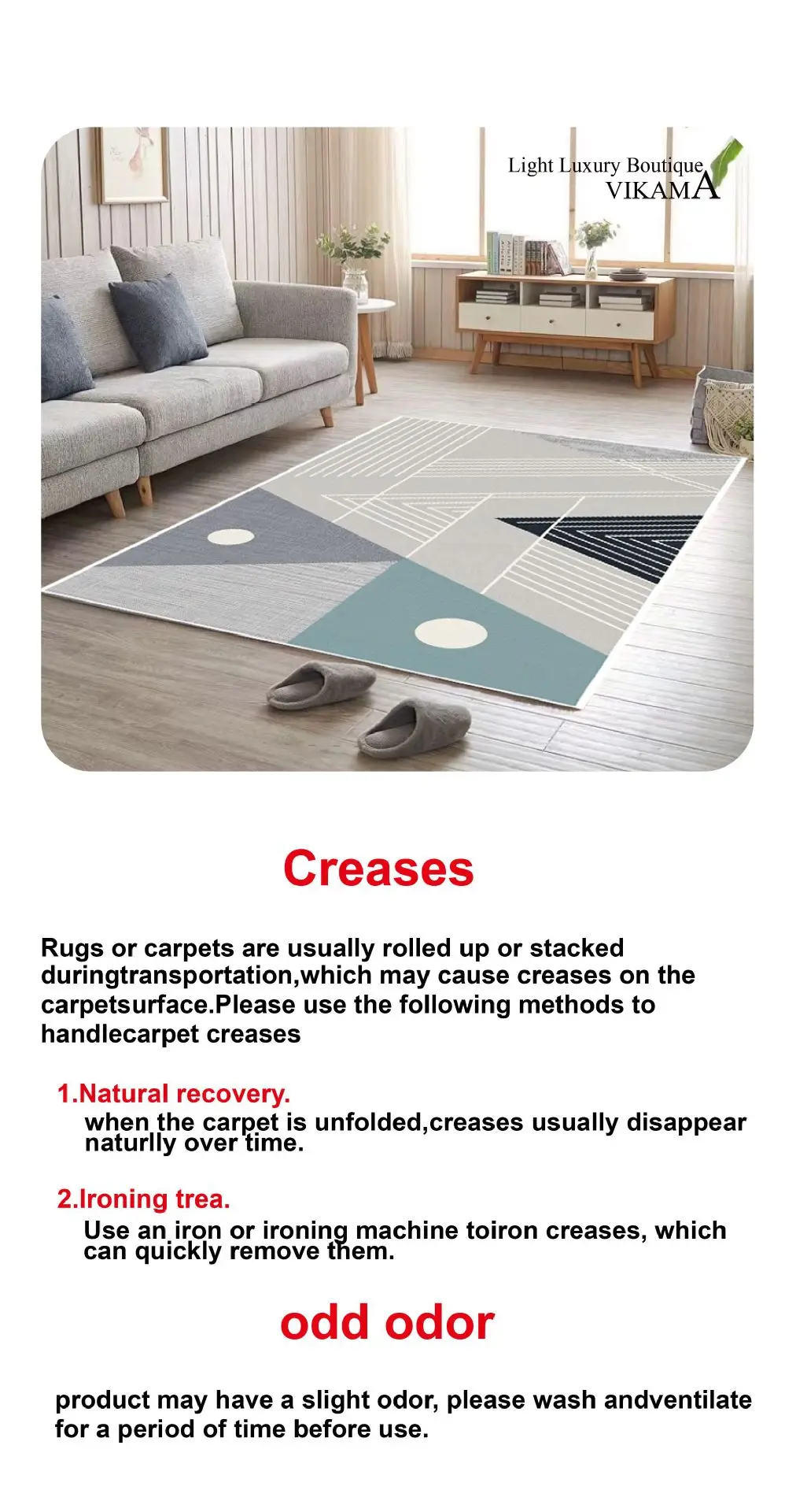 Due to the volume of the carpet is too large, it can only be packaged by folding. It is inevitable that there will be creases, which is not a quality problem. The crease will disappear over time, and it can also be solved by ironing. Hope you can understand.