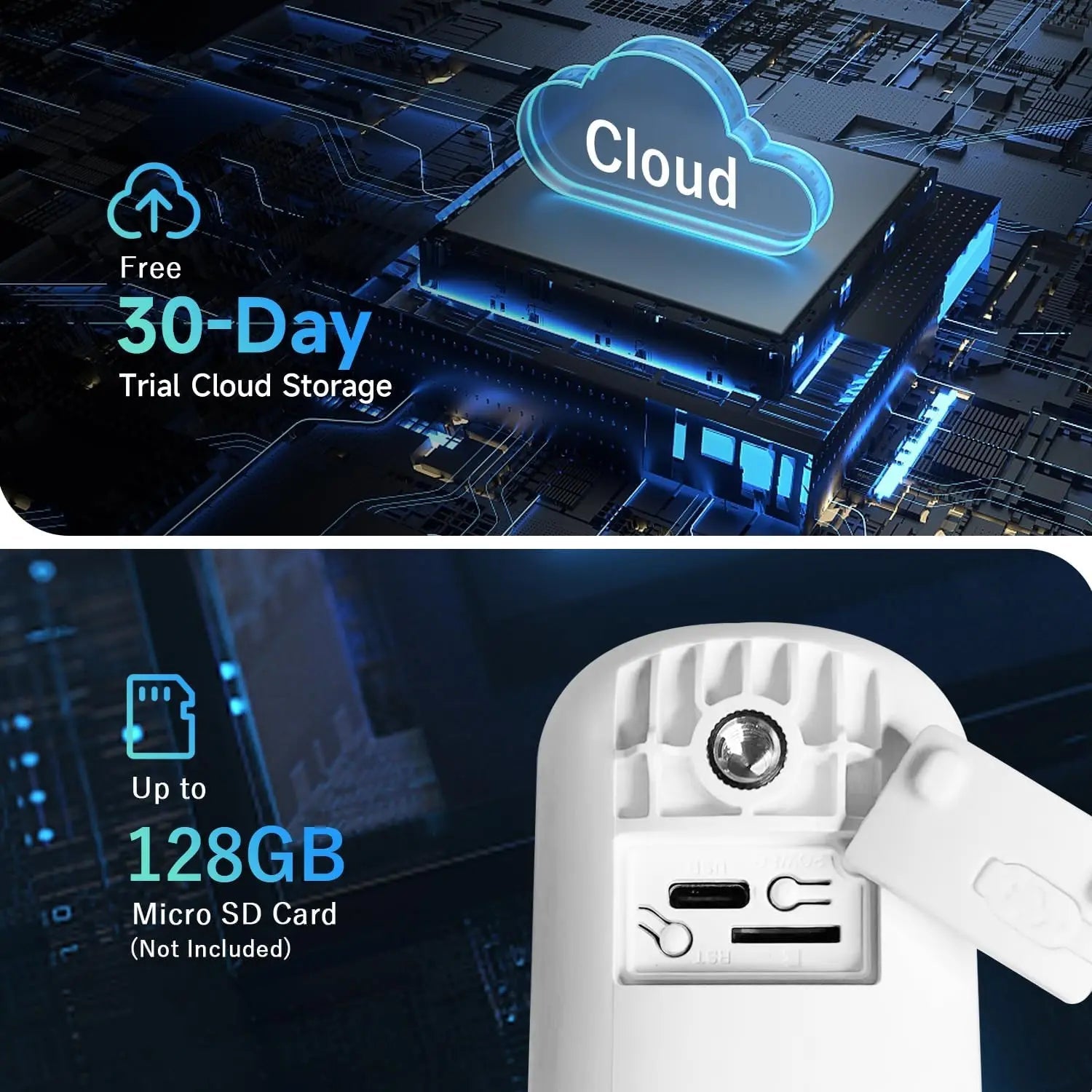 Supports up to 128G TF card and cloud storage,and offer free rolling past 3 days cloud storage, 30 days free trial, when the cloud storage trial end,it will be charged.